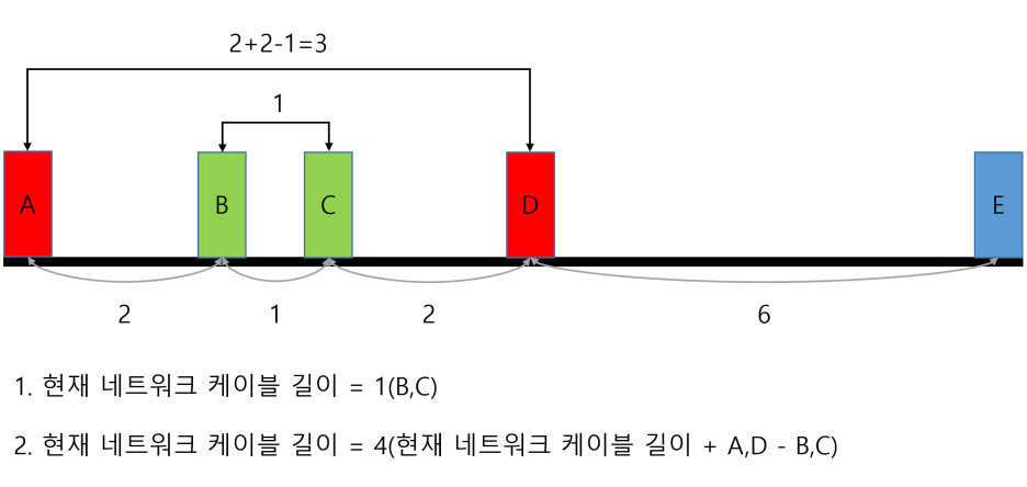 여기서 가장 길이가 짧게 가져갈 수 있는 방법은 A-B와 C-D를 선택하는 것이다.